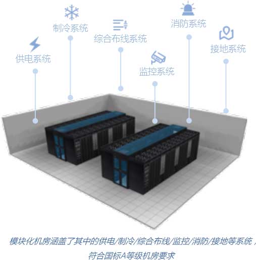 它由不同的功能部件组成一个完整的机房模块,集机架、配电、制冷、监控、管理与维护、安全等系统于一体,实现了供电、制冷和管理组件的无缝集