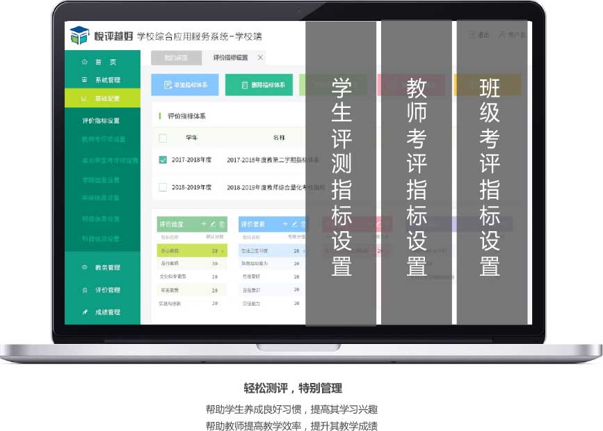 悦评越好学校综合素质测评应用服务系统是一款基于国家倡导“大力发展素质教育”的新时代背景,借鉴先进的IT信息化技术,帮助学校与家庭实现对学生综合素质 全面评测与关注、真正帮助学校提效减负,有效规范学生日常行为 ,有效增强师资队伍实力的互联网教育服务产品。系统包括一个学校WEB管理平台、2个小程序(教师端 +家长端),核心业务板块包括四大块:学生测评、教师考评、班级考评、综合管理。